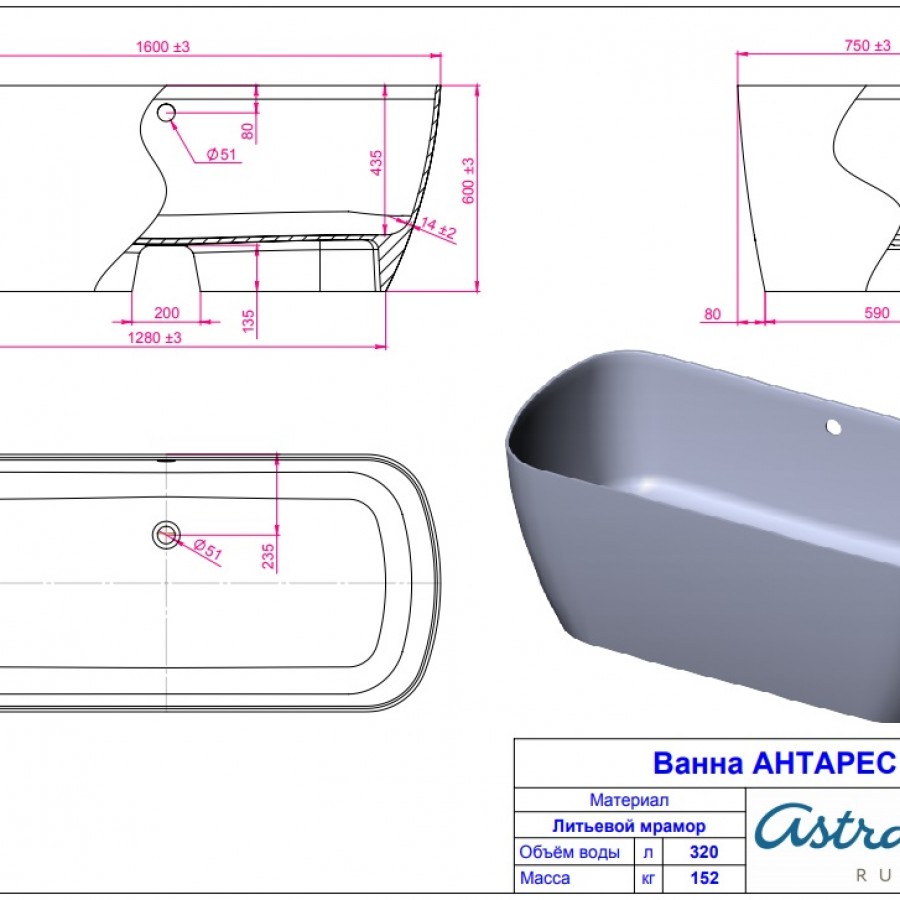 Ванна из литьевого мрамора Asrta-Form Антарес 160х75 см