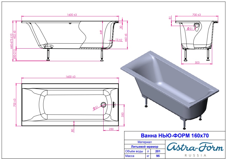 Ванна из литьевого мрамора Asrta-Form Нью-Форм 160х70 см