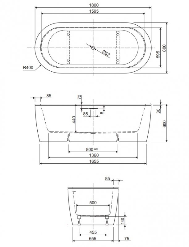 Акриловая ванна Cezares SLIM CENTRAL-180-80-60-W37-SET 180х80 см